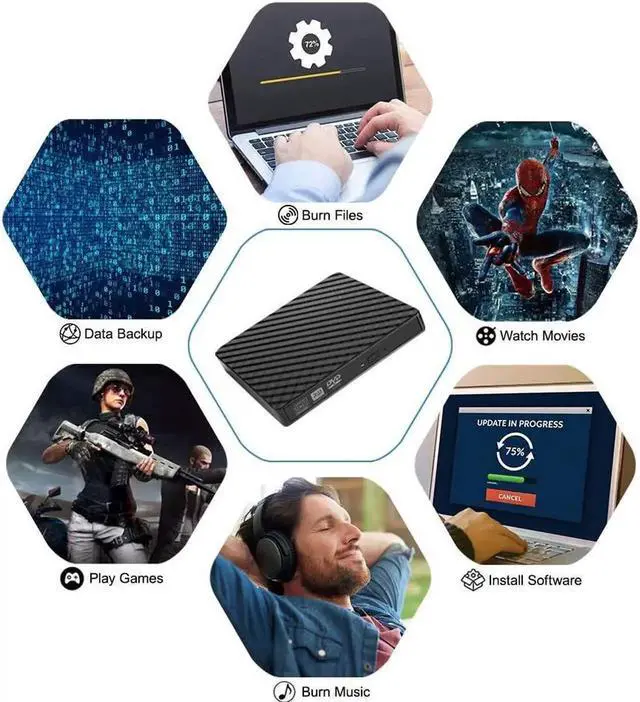 [PLUG AND PLAY] No need to download software to use the dvd drive, just plug it into computer USB port and the dvd drive usb will be detected. Powered by USB port, it's convenient for you wherever to go. With this external cddvd drive, you can record CD, music, video, install software or CD / DVD backup disc. SUPPORT COMPATIBLE SYSTEMS: Windows 98 / 2000 / XP / Vista / Windows 7/8/10, Mac OS 8.6 or higher system.