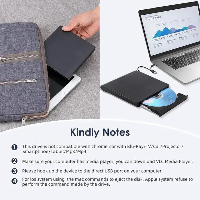 Wide Compatible SystemThe CD/DVD drive compatible with Mac, MacBook Pro, MacBook Air, iMac (mac OS), as well as Linux, Windows 11/10/8/7/XP laptop and desktop computers. (NOTE: DO NOT support Chromebook, TV, iPad, Truck, and Car).