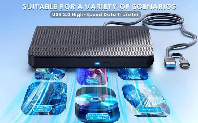 Powerful function: This external bluray drive has powerful storage capacity and fast reading speed Turbocharge workflows with USB 3.0s 5Gbps bandwidth6X faster than USB 2.0. Effortlessly manage BD(100GB). CDs (700MB), DVDs (4.7GB), and dual-layer DVDs (8.5GB). has strong error correction capability, impact resistance, low noise, and low power consumption.(Note: Incompatible with TVs, Tablets, PS4, iPads, Chromebooks, Projectors, or Vehicles.)