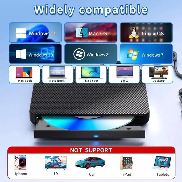 Powerful function: This external bluray drive has powerful storage capacity and fast reading speed Turbocharge workflows with USB 3.0s 5Gbps bandwidth-6X faster than USB 2.0. Effortlessly manage BD (100GB). CDs (700MB), DVDs (4.7GB), and dual-layer DVDs (8.5GB). has strong error correction capability, impact resistance, low noise, and low power consumption.(Note: Incompatible with TVs, Tablets, PS4, iPads, Chromebooks, Projectors, or Vehicles.)