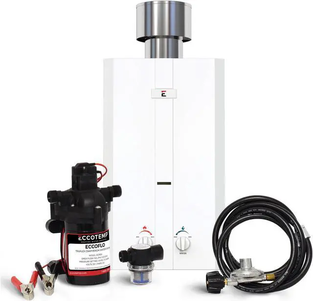 The Eccotemp L10 Thankless Water Heater is one of the hottest thankless water heaters on the market! The Eccotemp L10 Thankless Water Heater gives you endless hot water at your cabin, summer cottage, lake home, potting shed, RV, camper, horse washing stall or wherever else you need hot water. The Eccotemp L10 Thankless Water Heater delivers up to 2.6 Gallons Per Minute of hot water ranging from 80-165 degrees F, plenty for 1-2 hot water applications running at the same time. The 2 "D" cell battery ignition starts the flame only when water is running, so there's no chance of overheating. It is perfect for off grid or areas where you have limited electricity. Designed for a more permanent installation, the L10 comes with standard 1/2" NPT fittings, making it easily plumbed in with standard fixtures. The ideal operating range is 25-80 PSI. The system also works great on modified water systems with items such as a 12 volt pump.