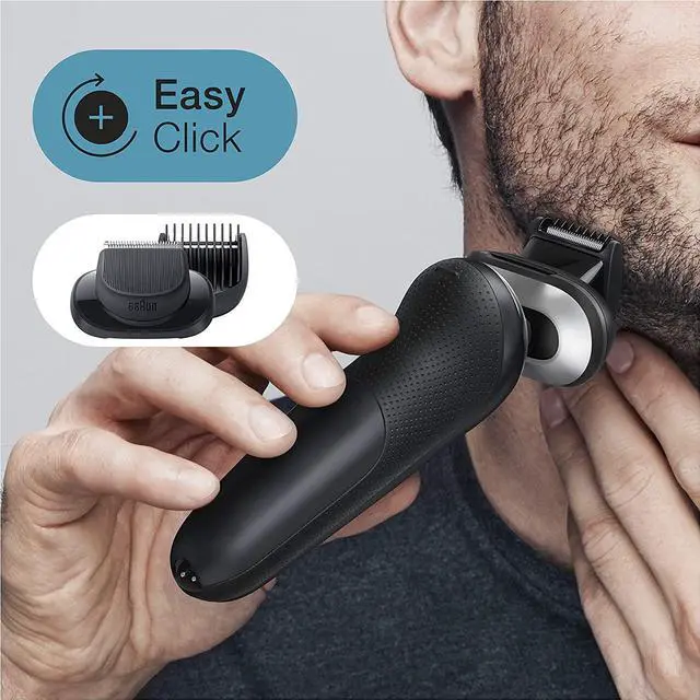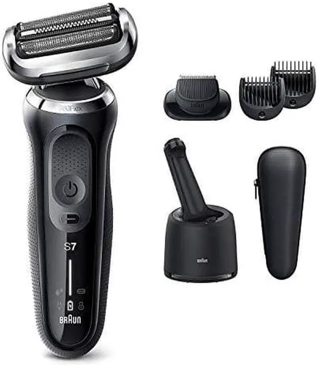 Braun Series 7 electric shaver for men with 360 degree adjustment for a smooth shave. Features AutoSense technology that reads and adapts to your beard density, removing more hair with every stroke. The Li-Ion battery provides up to 3 weeks of shaving and a quick 5 min charge. This men's electric razor is 100% waterproof for wet and dry use. Includes 4in1 SmartCare Center and beard trimmer attachment. Box includes 1 x Series 7 Electric Shaver for Men - Black 1 x SmartCare Center 1 x Beard Trimmer Attachment 1 x Travel Case 1 x Smart Plug for 100-240 Auto Voltage Adjustment 1 x Cleaning Brush.