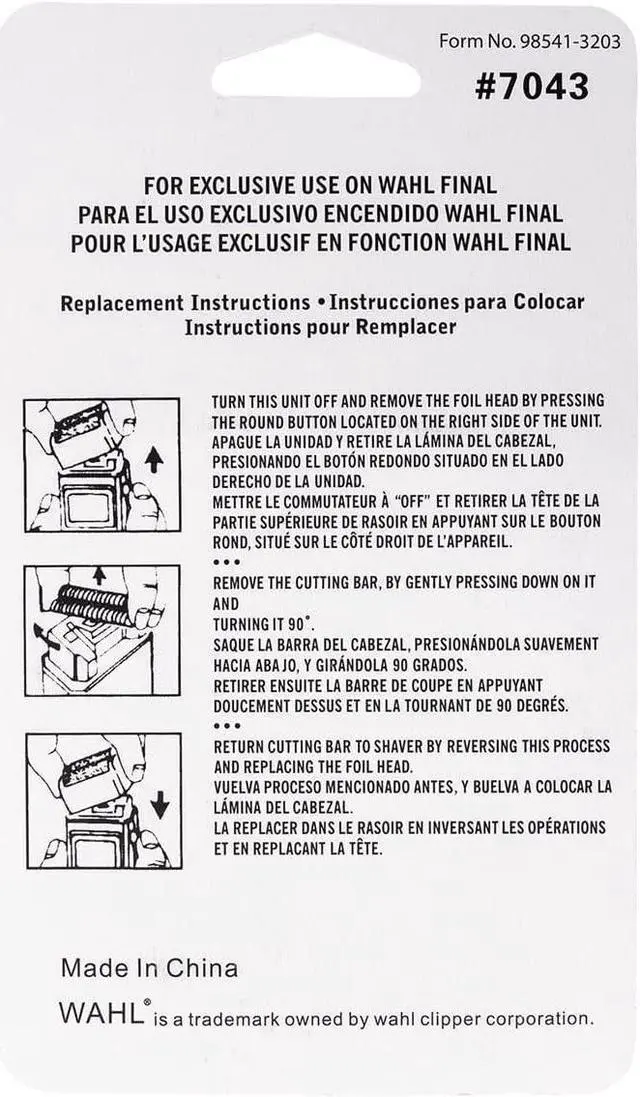 PRODUCT SPECIFICATIONS: Professional 5 Star Replacement Finale Super Close Foil and Cutter Bar Assembly (#7043) Compatible only with the Wahl 5-Star Finale Shaver.