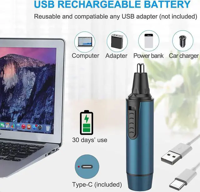 Insteading of AA batteries. This nose hair trimmer for men comes with rechargeable USB cable and built-in battery to make sure sufficient power at anytime anywhere, no need to buy more batteries.