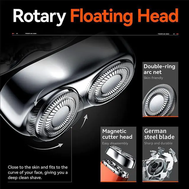 Gentle & Close Shave yoose rotary shaver features a double ring arc shaving head. The round shaving head whose cambered blade units ensure gentle, yet precise operation. Skin-friendly shaving without irritation. Floating design, shaving close to the face. German steel automatic grinding blade, always keep sharp. Enjoy a comfortable, clean shave.