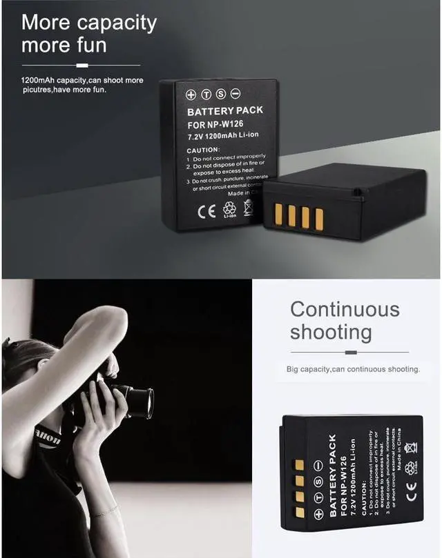 • Compatible models: For Fujifilm NP-W126 NP-W126s .HS30EXR,HS33EXR,HS35EXR, HS50EXRX100FX-PRO1,X-PRO2X-A1, X-A2, X-A3, X-A5,X-A10,X-A20X-E1,X-E2, X-E2S, X-E3,X-E4X-M1X-T1,X-T2,X-T3,X-T30X-T10, X-T20,X-T100,X-T200, X-100Vect