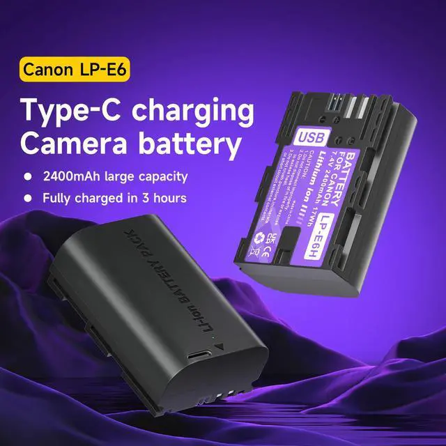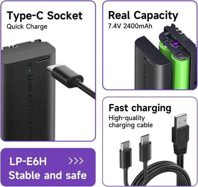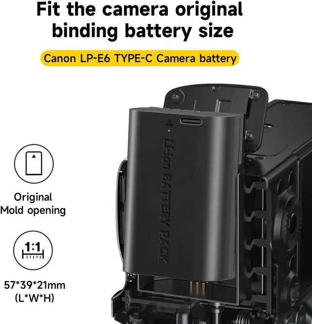 • 4.Multiple Charging Options:The LP-E6 USB-C Rechargeable Camera Battery can be charged from a power bank, power strip, car charger or other dedicated charger. Quickly charge the battery by connecting to a portable charger or wall charger using the supplied USB Type A to Type C charging cable.
