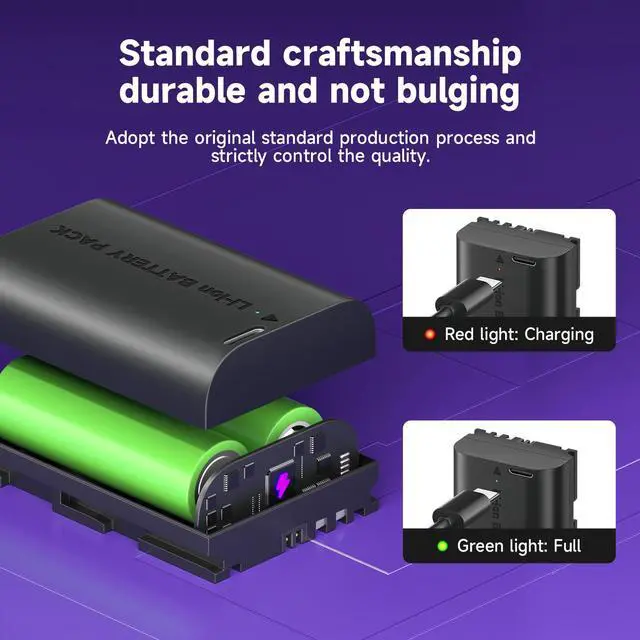 USB-C Fast Charging: This LP-E6 battery has a USB Type-C charging port that reduces charging time by 40% compared to other USB-C camera batteries, and reduces charging time by 65% compared to conventional charging. With high current charging (5V/2A), you can have a full battery round 3 hours. And it comes with a charging indicator to clearly show the charging progress. Red indicator for charging, green indicator for fully charged.