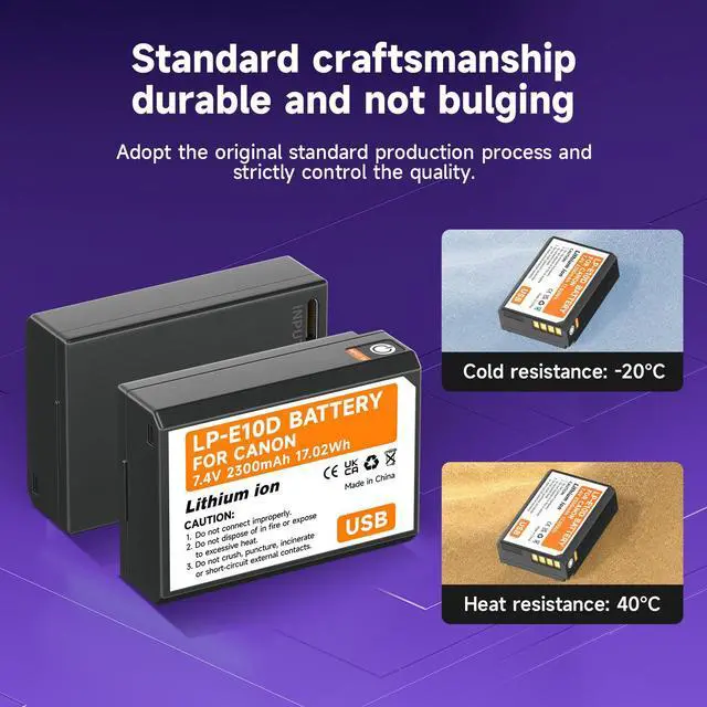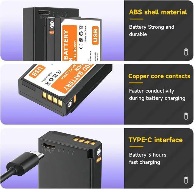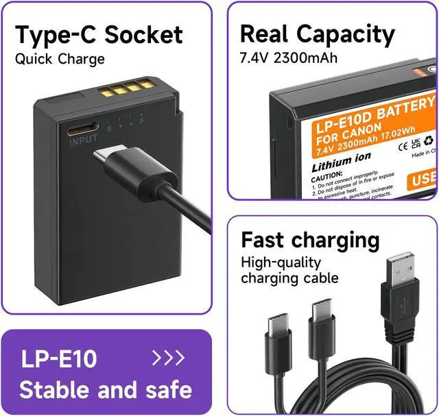 USB-C Fast Charging: This LP-E10 battery has a USB Type-C charging port that reduces charging time by 40% compared to other USB-C camera batteries, and reduces charging time by 65% compared to conventional charging. With high current charging (5V/2A), you can have a full battery round 3 hours. And it comes with a charging indicator to clearly show the charging progress. Red indicator for charging, green indicator for fully charged.