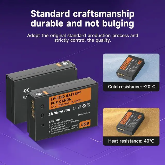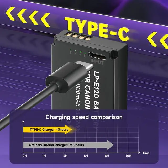 USB-C Fast Charging: This LP-E12 battery has a USB Type-C charging port that reduces charging time by 40% compared to other USB-C camera batteries, and reduces charging time by 65% compared to conventional charging. With high current charging (5V/2A), you can have a full battery round 3 hours. And it comes with a charging indicator to clearly show the charging progress. Red indicator for charging, green indicator for fully charged.