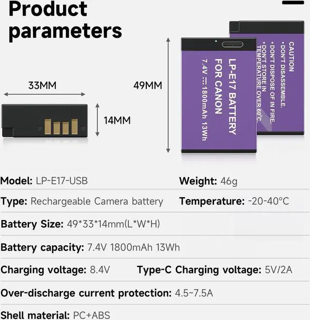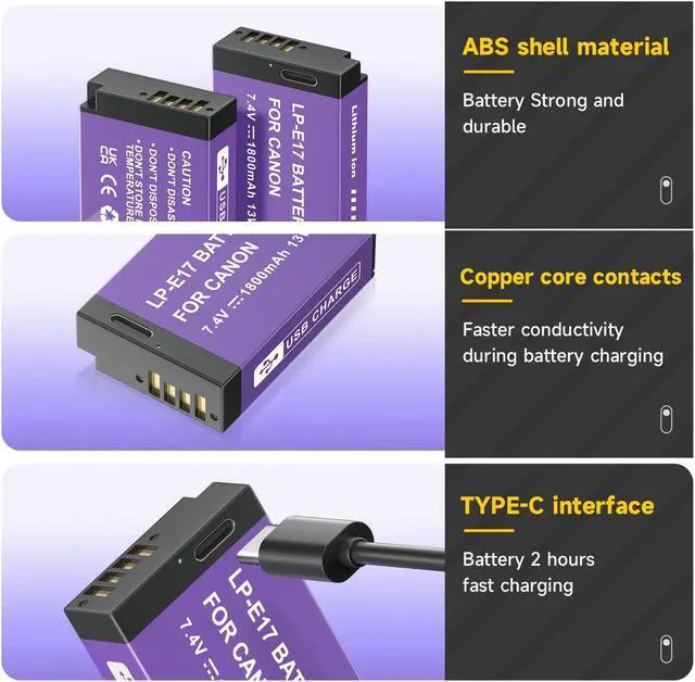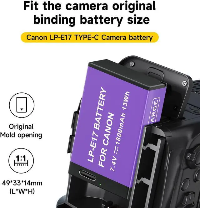 USB-C Fast Charging: This LP-E17 battery has a USB Type-C charging port that reduces charging time by 40% compared to other USB-C camera batteries, and reduces charging time by 65% compared to conventional charging. With high current charging (5V/2A), you can have a full battery round 3 hours. And it comes with a charging indicator to clearly show the charging progress. Red indicator for charging, green indicator for fully charged.