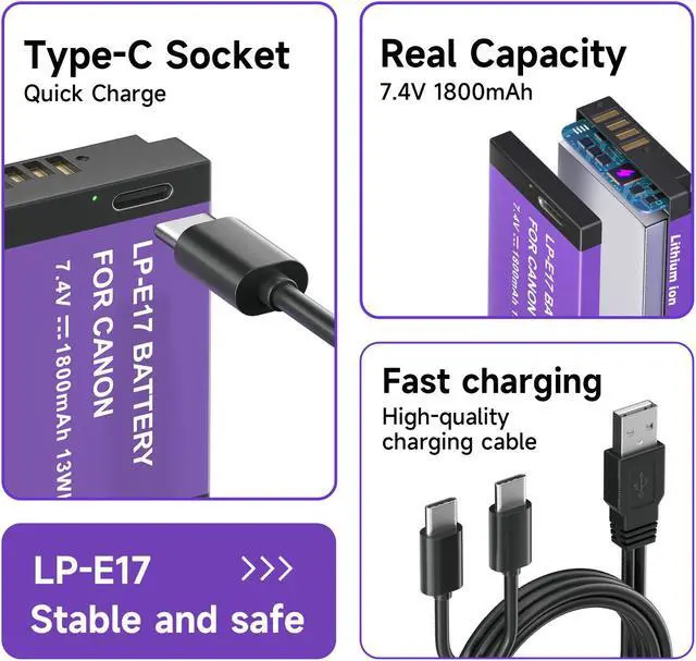 Multiple Charging Options: The LP-E17 USB-C Rechargeable Camera Battery can be charged from a power bank, power strip, car charger or other dedicated charger. Quickly charge the battery by connecting to a portable charger or wall charger using the supplied USB Type A to Type C charging cable. Also compatible with the original charger battery and charger sets