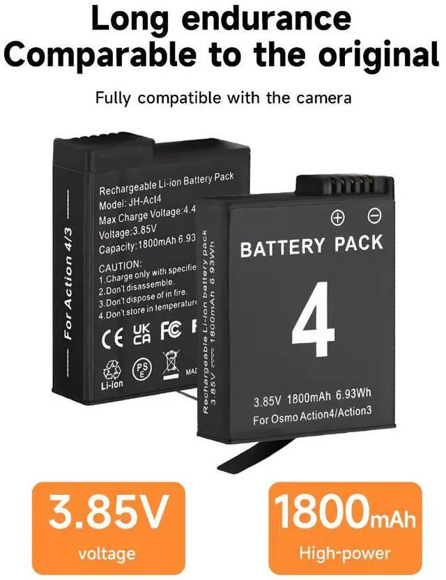 This DJI Osmo Action 3-DJI Osmo Action 4 battery has passed the FCC CE UL CUL ETL GS certification,Over-Heated, Over-Charge, Over-Voltage, Short-Circuit protection, multiple safety features that work together to provide ultimate protection and performance for your devices.