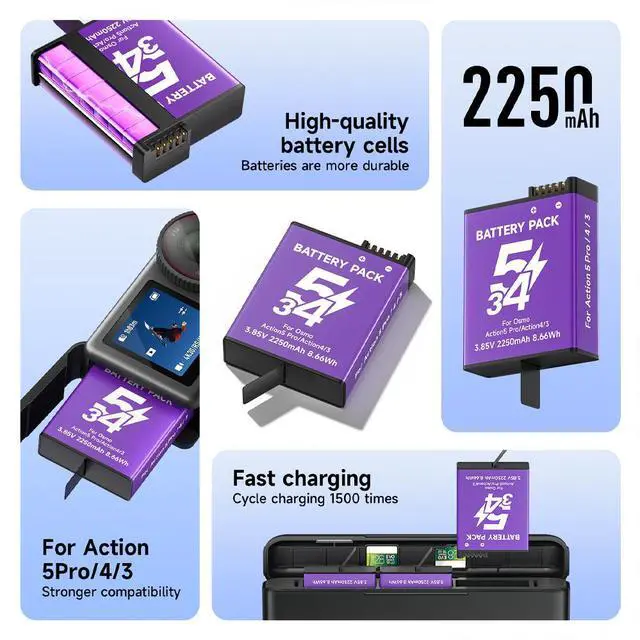 • Long-lasting Battery Life:Osmo Action 5 Pro/4/3 batteries offer a higher capacity of 2250mAh, stable 3.87V voltage, and 8.66Wh energyoutlasting OME/third-party alternatives, unleashing your creativity fully