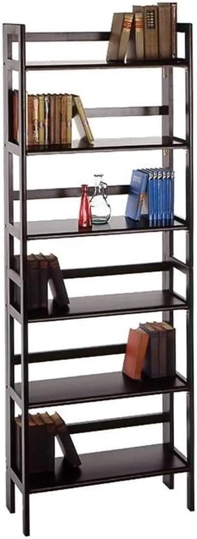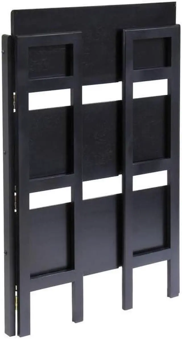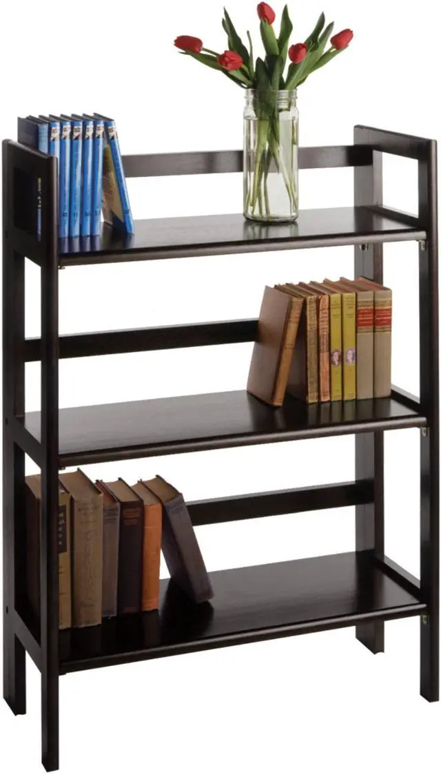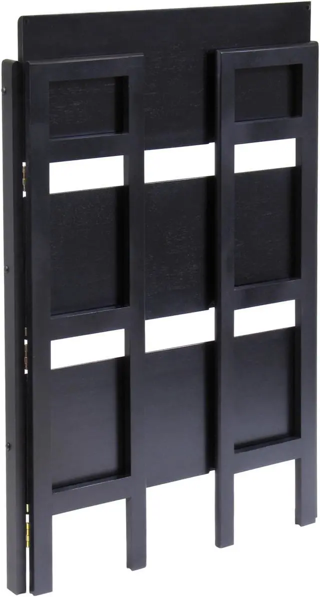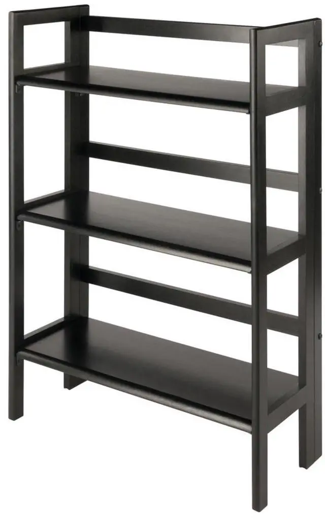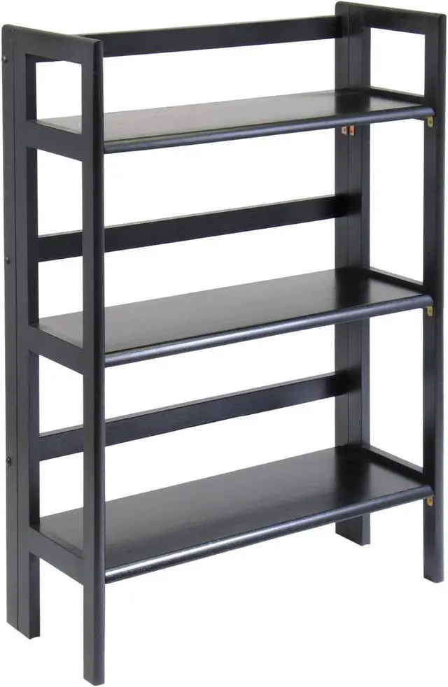Book shelf Great for books or displaying your favorite things Folds up for storage or moving Stackable Made of solid wood Sturdy rectangular shelves Open ladder style sides Back support rails Black 3 tiers Length: 11.5Width: 27.8Height: 38.5