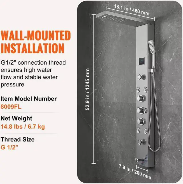 5. The G 1/2" interface thread size ensures a high water yield and stable pressure, making this shower system with body jets fit most bathroom fixtures and plumbing setups directly without needing a converter.