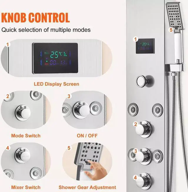 4. Say goodbye to battery hassles with our hydroelectric-powered LED display and top spray atmosphere light. Enjoy clear water temperature readings and convenient knob control for easy mode and temperature selection.