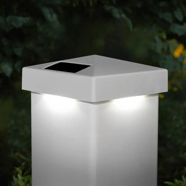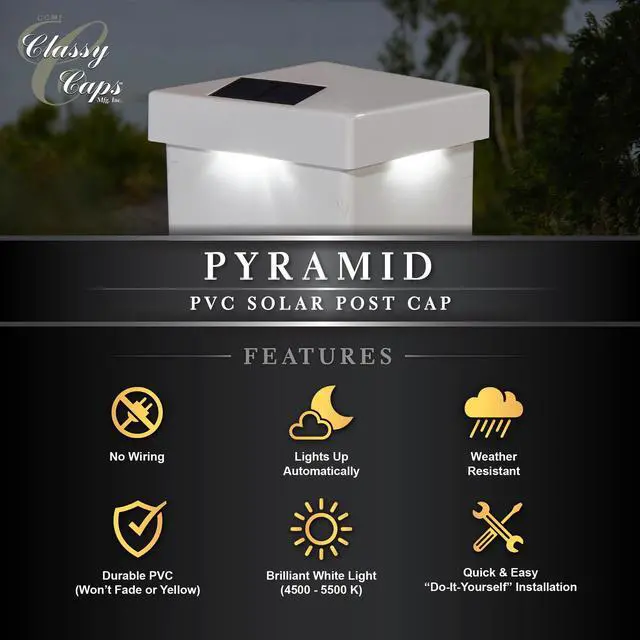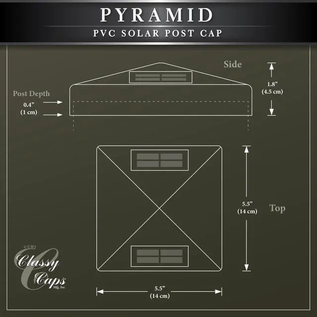 Our 5"x 5" Vinyl Pyramid solar post cap includes four high output surface mount LED's that are hidden from view, but as night falls this one of a kind patented design will cast an array of light onto all four sides of the post cap and surrounding area... a truly unique and exceptional style only from Classy Caps Mfg. Will fit over an actual 5"x5"post.
