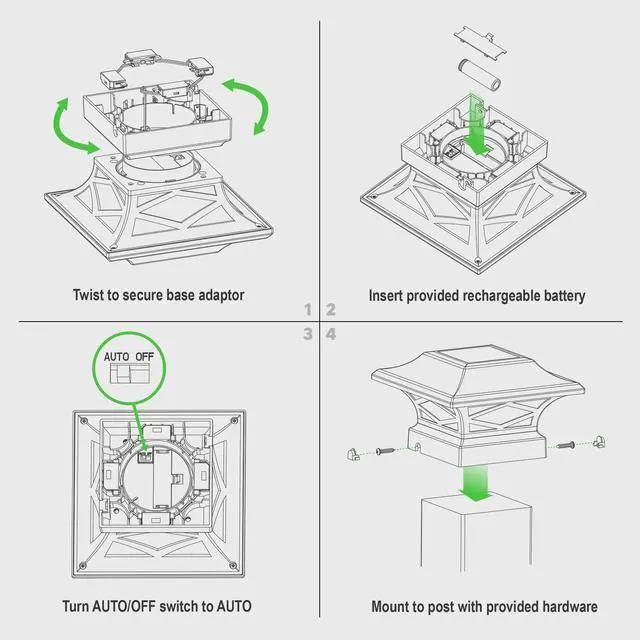 Introducing the durably crafted Kingsbridge dual lighting solar post cap, designed and manufactured exclusively by Classy Caps Mfg. Inc. This unique, one of a kind Solar Post Cap is a one-cap-fits-all patented design with the versatility to fit over four standard size posts. The cast aluminum Kingsbridge exudes quality, offering a monocrystalline solar panel and 3.2V LifeP04 rechargeable battery for many years of maintenance free reliability. The real pebbled glass lens and strategically placed surface mount LEDs will cast magnificent warm lighting accents to highlight your fence, deck, landscape and more.
