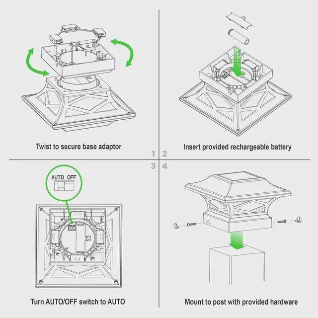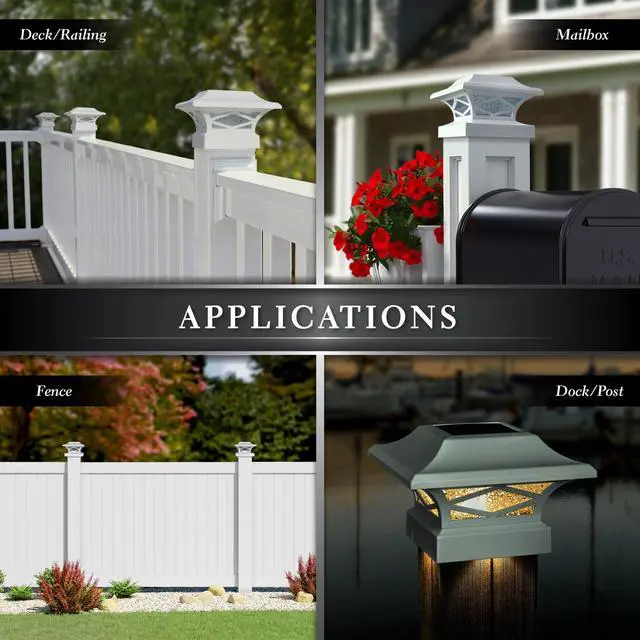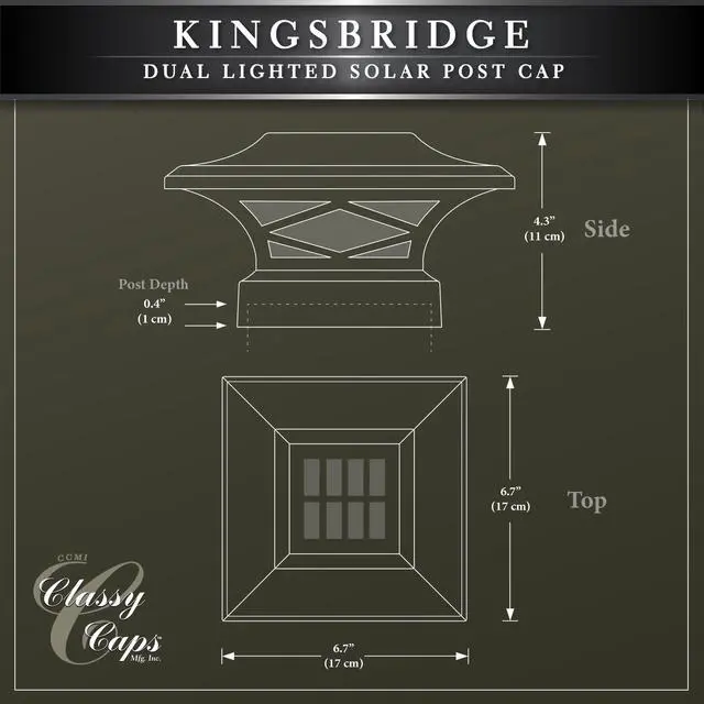 Introducing the durably crafted Kingsbridge dual lighting solar post cap, designed and manufactured exclusively by Classy Caps Mfg. Inc. This unique, one of a kind Solar Post Cap is a one-cap-fits-all patented design with the versatility to fit over four standard size posts. The cast aluminum Kingsbridge exudes quality, offering a monocrystalline solar panel and 3.2V LifeP04 rechargeable battery for many years of maintenance free reliability. The real pebbled glass lens and strategically placed surface mount LEDs will cast magnificent warm lighting accents to highlight your fence, deck, landscape and more.
