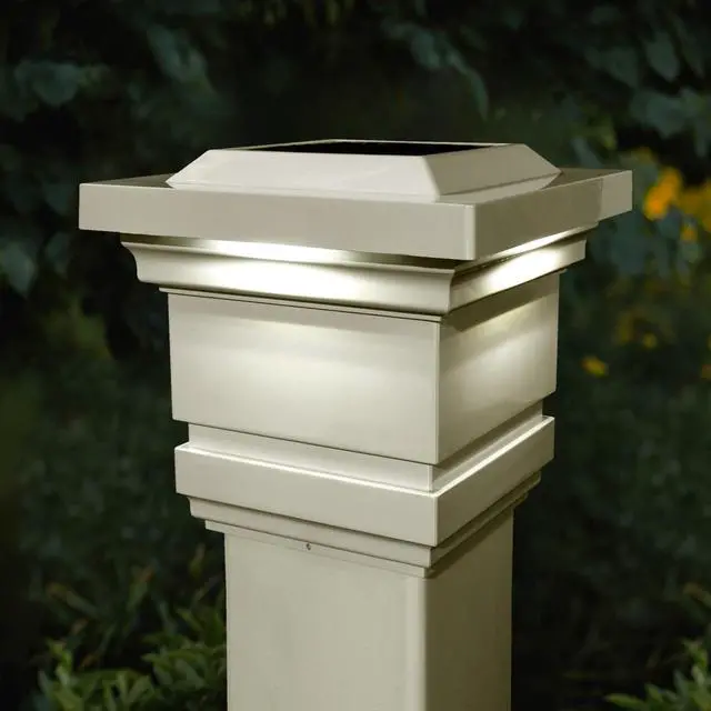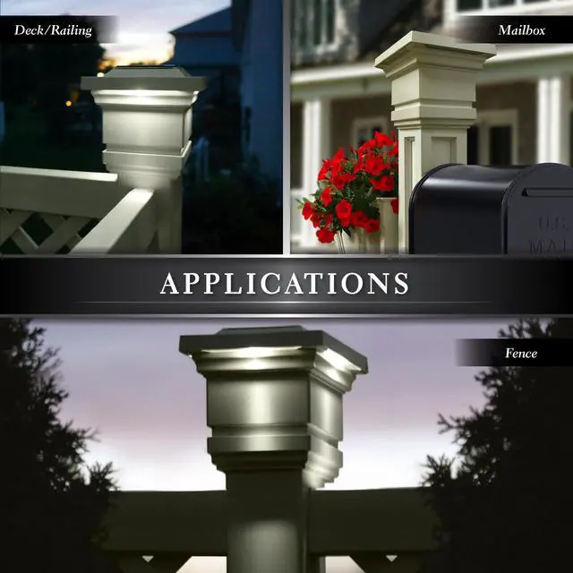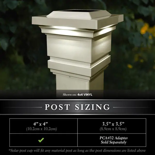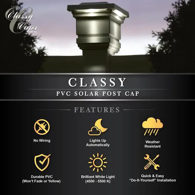 The Attractive traditional patented design of the original Classy Solar Post Cap will add radiance and allure to your fence or deck. Fabricated using four high output surface mount LEDs that will cast a brilliant white light downward onto the outside walls of the post cap and surrounding area, creating a unique ambience. Engineered to provide up to 12 hours of light automatically every night. Will fit over an actual 4" x4" post.