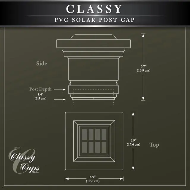 The Attractive traditional patented design of the original Classy Solar Post Cap will add radiance and allure to your fence or deck. Fabricated using four high output surface mount LEDs that will cast a brilliant white light downward onto the outside walls of the post cap and surrounding area, creating a unique ambience. Engineered to provide up to 12 hours of light automatically every night. Will fit over an actual 4" x4" post.