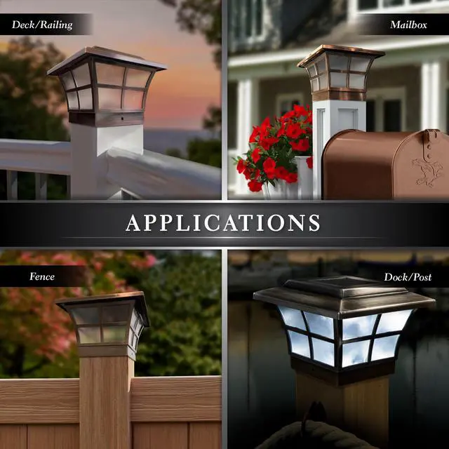 The 4x4 copper Prestige solar post cap is finished in a rich antique electroplated copper. Stylish and durable performance you can depend on. Our patented window frame design with frosted lens will create a unique ambiance. Will fit over an actual 4"x4" or 3.5" x 3.5" post ( 3.5" x 3.5" adapter included).