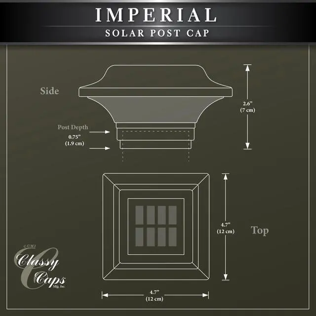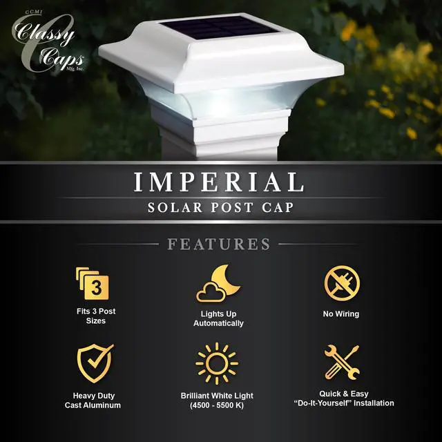 The modern yet elegant Imperial Solar Post Cap offers a clean contemporary design that is unequalled in performance. Its rugged cast aluminum construction with powder coated finish means no future painting. The Imperial was specifically designed for use with steel or aluminum posts. Will fit over three post sizes - 2.5" x 2.5", 2.25" x 2.25" and 2"x2"