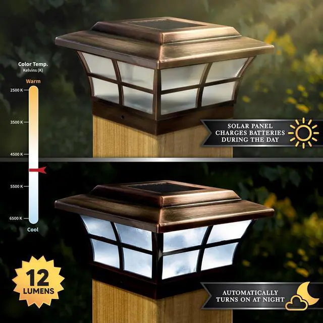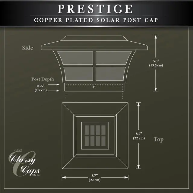 The 6x6 copper plated Prestige solar post cap is stylish and durable with performance you can depend on. Finished in a rich antique electroplated copper. Our patented window frame design and frosted lens create a unique ambiance. Will fit over an actual 5.5" x 5.5" post. (inside base diameter 5-5/8" x 5-5/8")