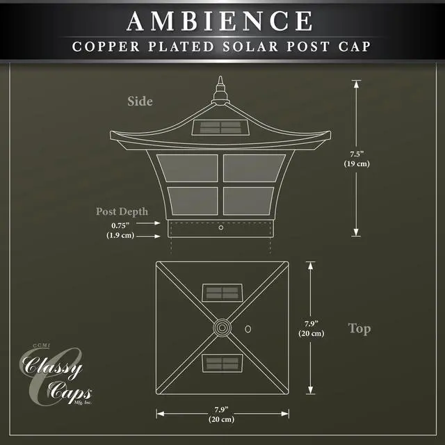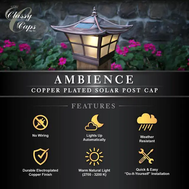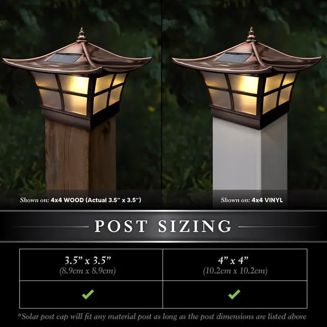 Attractively designed in a Japanese garden style, the patented 4"x4" copper electroplated Ambience solar post cap provides a warm yellow flickering light, giving the effect of a lit candle. Dependable performance with a unique style. Will fit over an actual 4"x4" or 3.5" x 3.5" post ( 3.5" x 3.5" adaptor included)