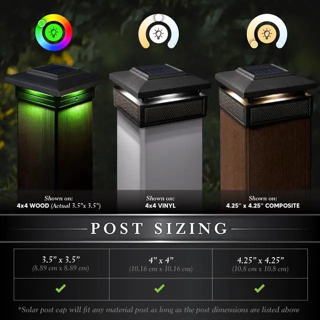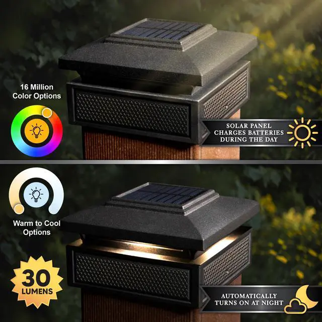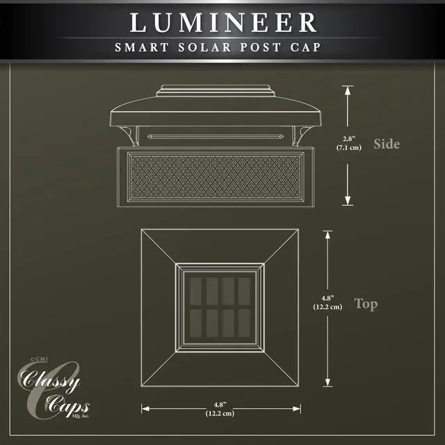 Introducing the new innovative Classy Caps Lumineer Smart Solar Post Light! Our first smart Solar post light will creatively accent your outdoor space. Manufactured from the highest quality materials, the versatile black 2 in 1 design can be mounted on 3 different size posts to light up your mailbox, deck posts, or fence. Group multiple lights together to create a full atmosphere for your outdoor living space that will truly impress. Remote control the solar light with your cell phone through Tuya Smart App no matter where you are in the world.