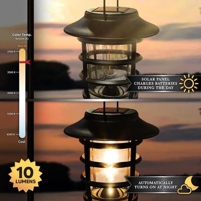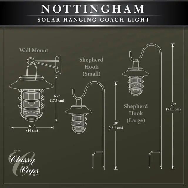 The Classy Caps Nottingham Solar Hanging Coach Light will bring elegance and a unique timeless architecture to your outdoor setting. The cast aluminum base, glass lens and stainless steel solar top ensure long lasting durability. The high performance Edison style LED will cast a warm natural light that will automatically turn on at dusk. The Nottingham Solar Hanging Coach light includes a metal wall bracket and garden hook so that it can easily be mounted to your deck, house or placed in a garden setting. This charming solar coach light can also be placed on a table top.