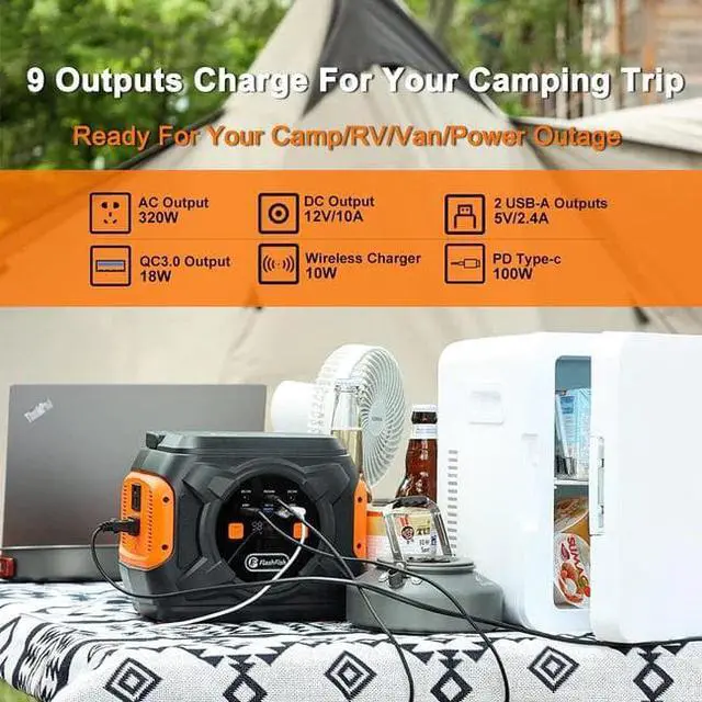 9 OUTPUTS BACKUP POWER FULFILL YOUR NEEDS: Featuring 2 * PURE SINE WAVE AC outlets, can power devices under 320W, 1 * 100W USB-C ports, 2 * DC ports, 2 * USB-A ports, 1* QC 3.0 port, 1 * wireless charging pad. The battery generator can power 9 devices at the same time.
