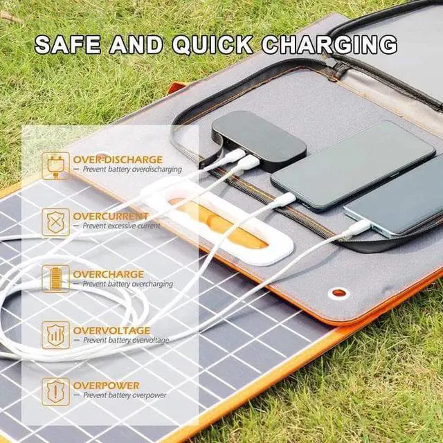2-USB SOLAR CHARGER: Featured with 1 * USB-C (65W) and 1 * USB-A (18W) output port, USB-C port support PD charging. Charging multiple small devices at the same time, prepare for your smartphones and tablets (iPhone, iPad, Samsung Galaxy), digital cameras, etc. Ideally suited for outdoor life and even unexpected power outages.