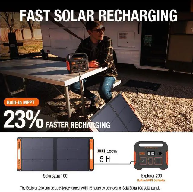Jackery SolarSaga 100W Solar Panel converts solar to renewable power with this monocrystalline solar panel. With a high solar conversion efficiency of 24.3 %, it's perfectly suited for outdoor activities and for emergency power outages. The ETFE-laminated case extends the lifespan of the solar panel, and weighs in total just 10.33 lbs. It's lightweight, foldable, IP65 waterproof-rated, and easy to carry around for taking on your off-grid adventures.