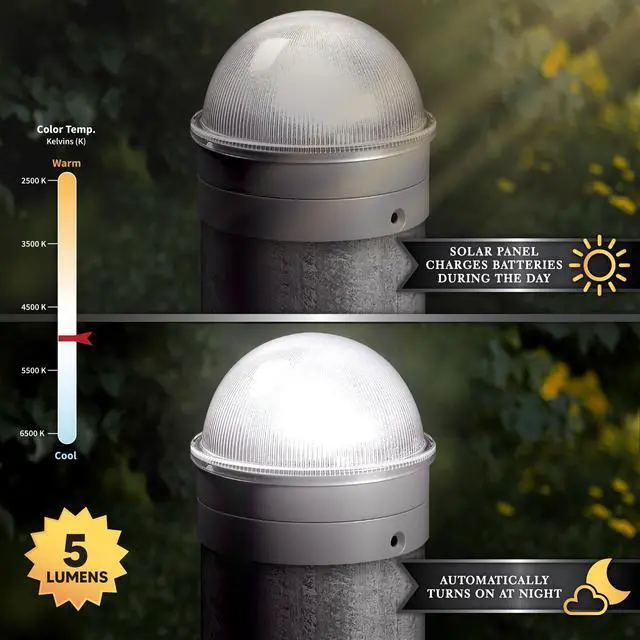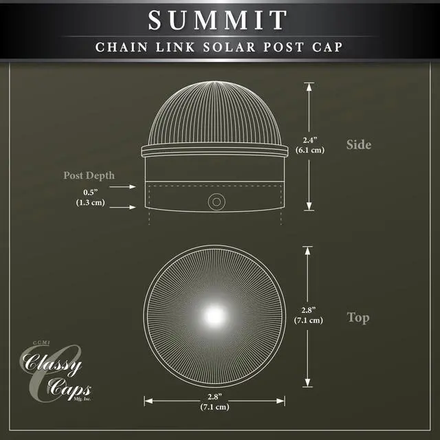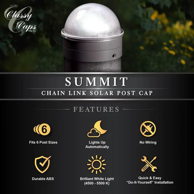Add a touch of class to your chain link fence with our high performance Summit solar post cap. This one of a kind design by Classy Caps will compliment your existing chain link posts. Turns on automatically every night casting a brilliant white light onto the surrounding area. Manufactured to fit over six standard chain link fence posts - 3" dia., 2-7/8" dia., 2.5" dia., 2-3/8" dia., 2" or 1-7/8" dia.
