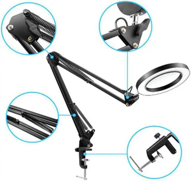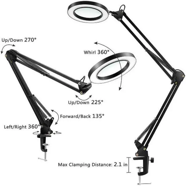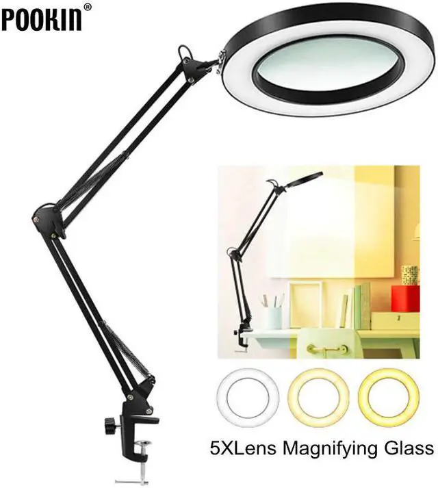 Desk Lamp Clip on Light 5Xlens Magnifying Glass Clamp Long Arm Dimming Table Lamp 3 Colors For Reading Tattoo and Computers