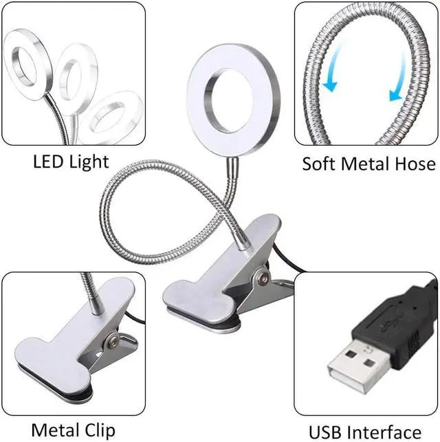 360°Gooseneck & Clip Base : The flexible and adjustable gooseneck can be adjusted 360 degrees, bendable neck design lets you place the light anywhere you need. The sturdy metal clip with non-slip pads can be opened up to 2.3inch.
