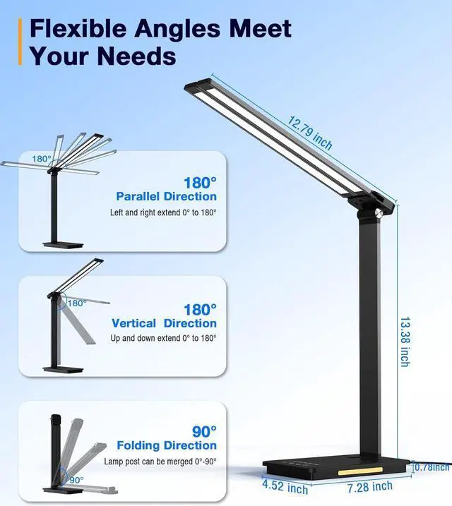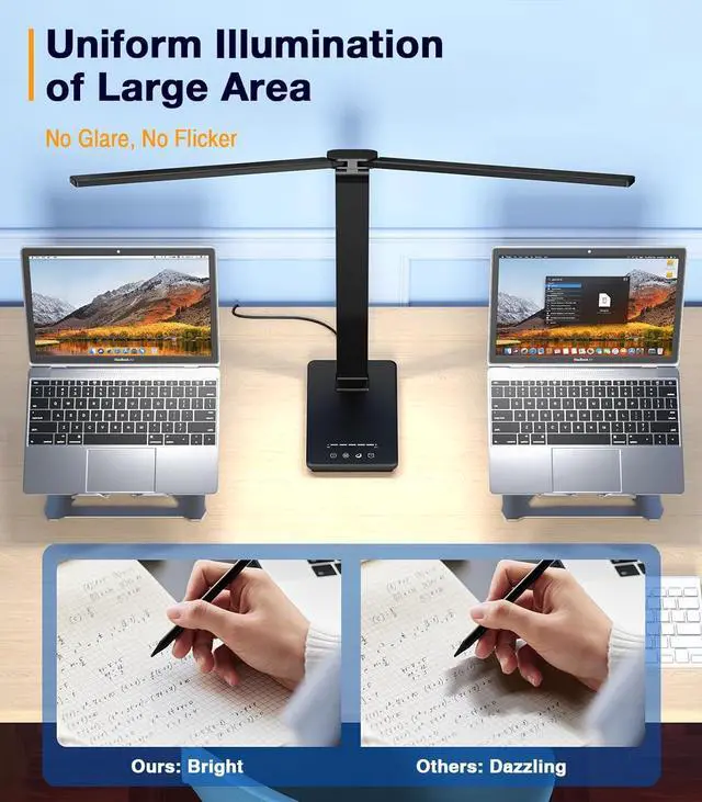 Double Head & Flexible Angles Design-- The desk lamp featuring an exceptional dual-head design so wide LED light bar provides a lot of coverage the modern desk lamp exceeds the lighting capabilities of single-head desk light, providing diffused lighting to cover two distinct work areas. The office lamp' s dual arm extends horizontally up to 180° or folds vertically up to 180°. You can adjust to virtually every possible angle you' ll ever need for optimal lighting conditions.