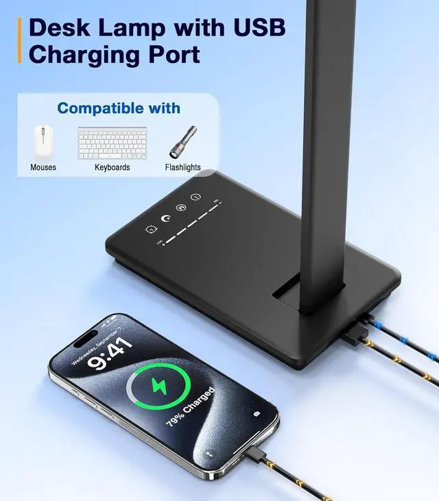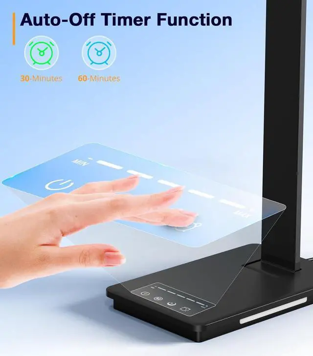 USB Charging Port & Auto-Off Timer -- To start, this desk lamps for home office designed a USB charging port to allow to charge their smartphones or plug in small devices, like a portable speaker or fan. This smart desk lamp also features a timer function, allowing the user to set 30 minutes or 60 minutes for the lamp for desk to automatically turn off. This function offers peace of mind and ensures that the user does not forget to turn off the office Light, even when occupied with other tasks