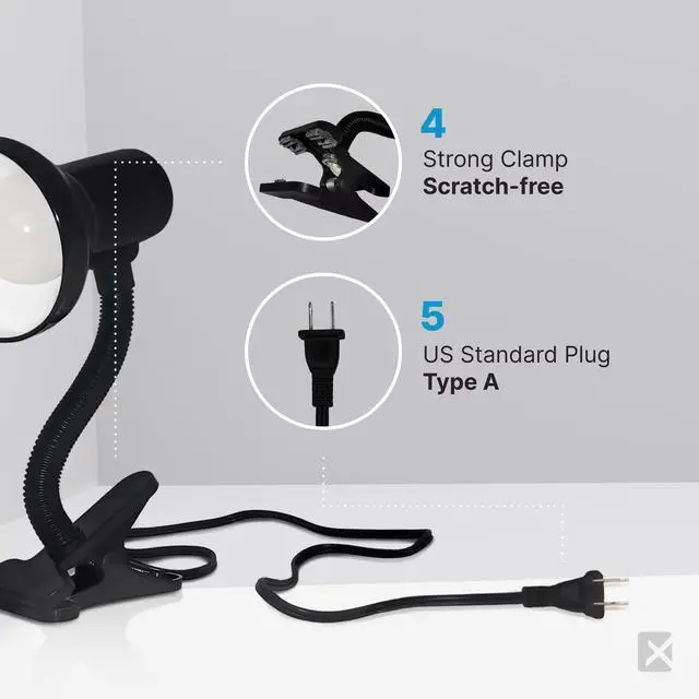 This simple and stylish looking clip-on desk lamp is ideal for providing light where needed using its flexible neck and is perfect for work use or any other type of activities. This black finish metal clamp lamp is easy to setup and use, easy to store, is portable, has a built in On/off switch which adds convenience and is highly flexible. It could be mounted on home office desks, computer desks, bedframes, headboards, counters, tool shed or any place you need bright illumination. This desk lamp can help you work more productively and efficiently. Weve bundled an A19 Energy Efficient 7W light bulb that will last over 25,000 hours equivalent to 22.8 years based on a 3 hours per day use and will provide bright and quality light. This desk lamp is much more than a decorative light accessory, it highly reduces eye strain since it makes it easier for the eyes to read fine print by using a focused light and reducing the glares and shadows from ambient room lighting. It could serve as a night light to avoid tripping over pieces of furniture when walking in an obscure room. Makes night reading in bed enjoyable and can be quite effortlessly mounted and transported from one place to another making it a great travel light accessory.