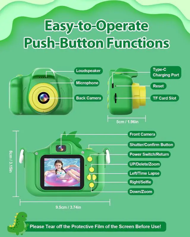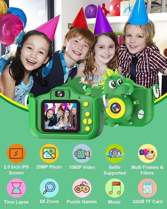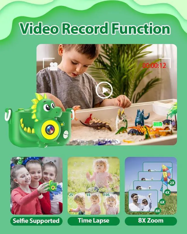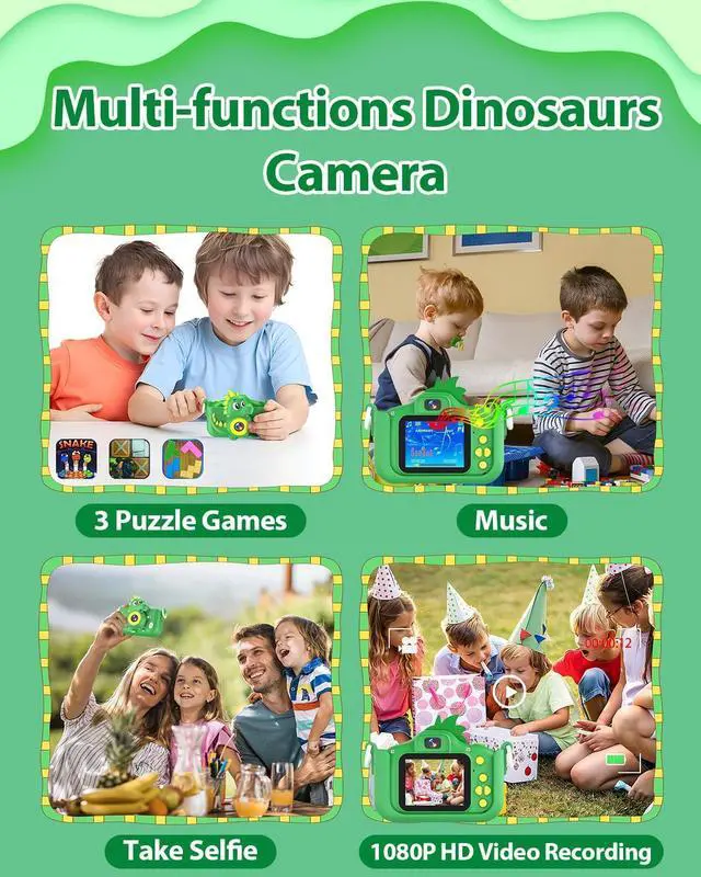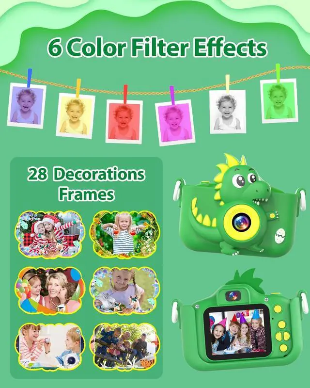 Multi-Functional Dino Toy Camera Beyond the basics of taking photos, playing music, recording videos, and playing games, this upgraded kid's digital camera also boasts time-lapse, 28 funny frames, and 6 filter effects that add a splash of color to photos, making photography a creative adventure for your little one. These cool features add extra fun to your child's camera experience, sparking their creativity and imagination.