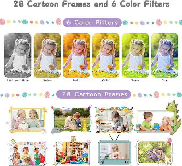 >>>Multifunctional Kids Digital Camera Toys: This wonderful kids camera can not only take photos/selfies, but also take up to 1920x1080P video. The camera software allows you to add the different filter and border to your photo, makes the photos fun! The detachable lanyard allow kids to wear the cute camera around their necks, it is also saved the camera from near-falls or lose it.