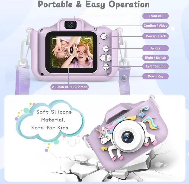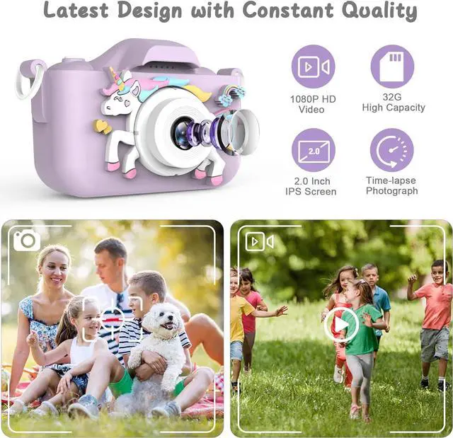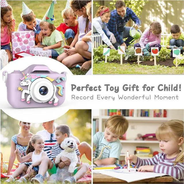 >>> New Upgrade Dual Lens Kids Camera: Colorful Unicorn Kids Camera, Brand New Design Packed with HD dual cameras, 1080P recording video, and 2 inch HD IPS eye protection screen, 8x digital zoom, 28 frames and 6 filters. This is an amazing little camera to encourage you children to explore nature. The high-quality and soft silicone feel will make your child could not put it down.