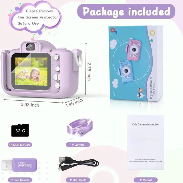 >>>What You Get: 1 x Camera for kids, 1x 32GB memory card, 1 x Reader card, 1 x USB Cable, 1 x Lanyard, 1 x User Manual.