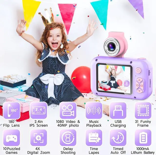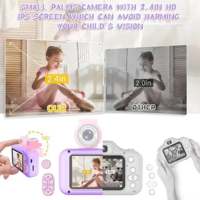 2.4 in IPS Screen&More comfortableThe mini body is equipped with a 2.4 inch IPS HD screen (other suppliers only have a 2 inch screen) to provide your child with 1080p high-definition pixels; The larger botton is more comfortable for children's hands.