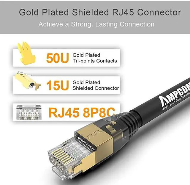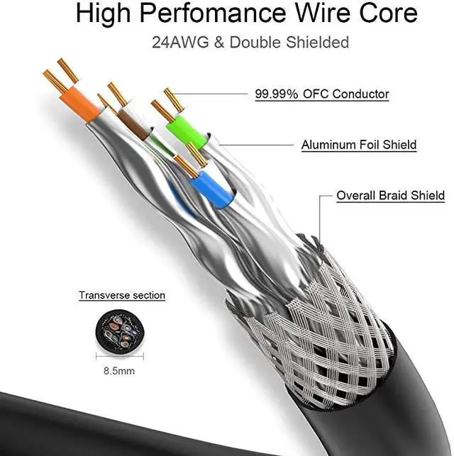 **********[Fast Speed] This Cat8 cable is capable of supporting bandwidths of up to 2 GHz (2000 MHz) for up to 30 meters of cabling and 25Gbps/ 40Gbs speeds. With the performance increased 4 times of CAT6A, it eliminates almost 100% of incorrect data or not being corrected by applications*****[Efficient Shielding] Industrial standard 50u gold plating Connector; Double shields(S/FTP) to avoid interference and data losses, critical in extreme performance applications; The copper cross-section larger than Cat 6A results in high power and less voltage drops, making it perfect for POE application*****[Solid Construction] Made in quality materials with latest technology assure you to use without worry.