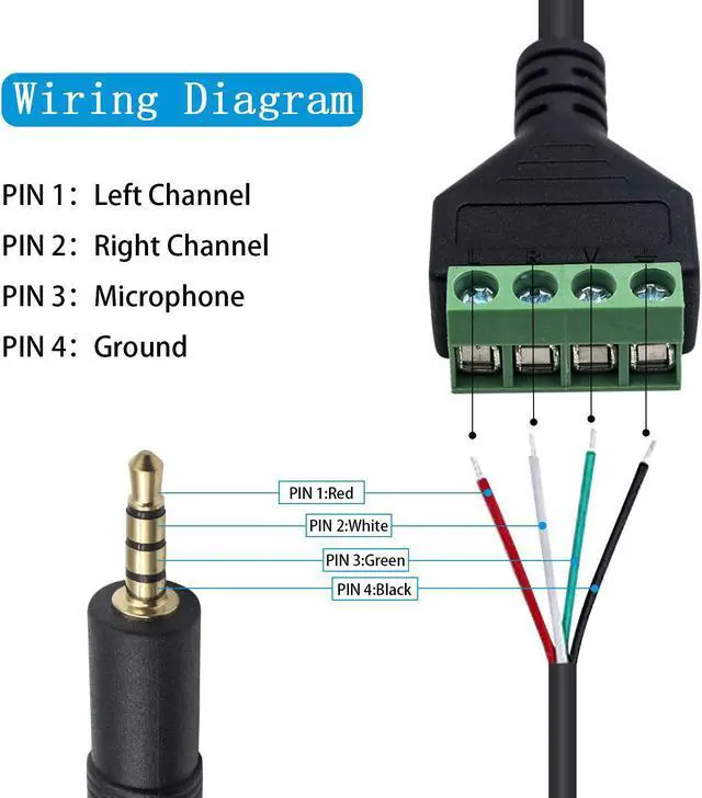 - No Soldering Required! Use Stranded Or Solid Core Wire And A Small Screw Driver To Create Custom Wiring Jigs. Wiring Diagram: Pin 1 - Red Wire; Pin 2 - White Wire; Pin 3 - Green Wire; Pin 4 - Black Wire. Omtp Standard: Pin1 - Left Channel; Pin 2 - Right Channel; Pin 3 - Microphone; Pin 4 - Ground. Ctia Standard: Pin1 - Left Channel; Pin 2 - Right Channel; Pin 3 - Ground; Pin 4 - Microphone.