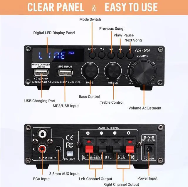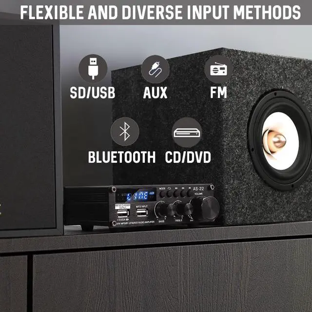 High FidelityThe AS-22BU bluetooth stereo receiver has upgraded audio processing chips. Low distortion and low noise allow you to enjoy wonderful music all the time.