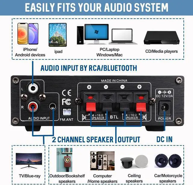 Excellent Bluetooth CompatibilityThe bluetooth stereo amplifier is compatible with all your favorite bluetooth devices(For iPhone, Android, Smartphone, iPad, laptop, Computer, etc. )